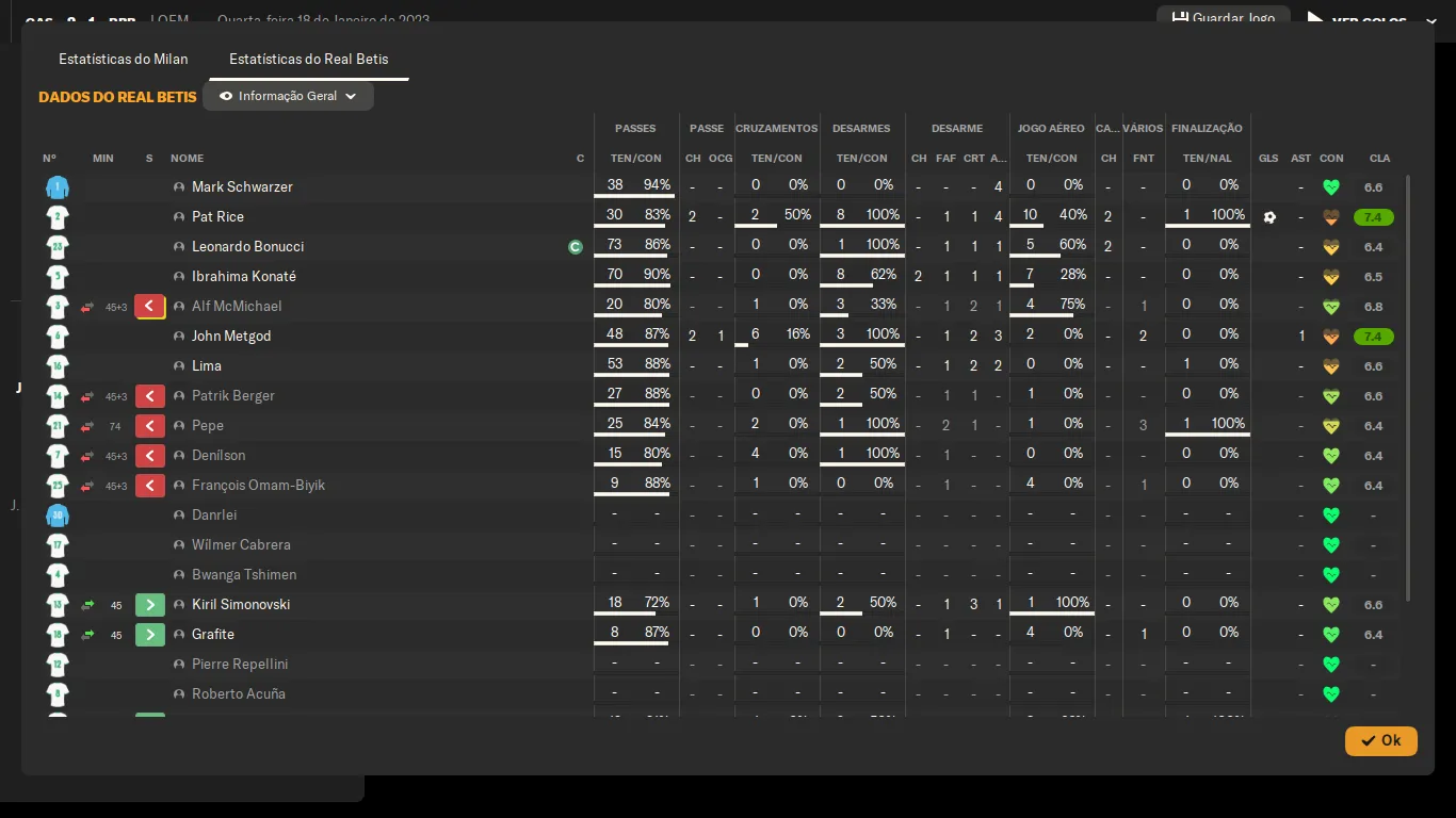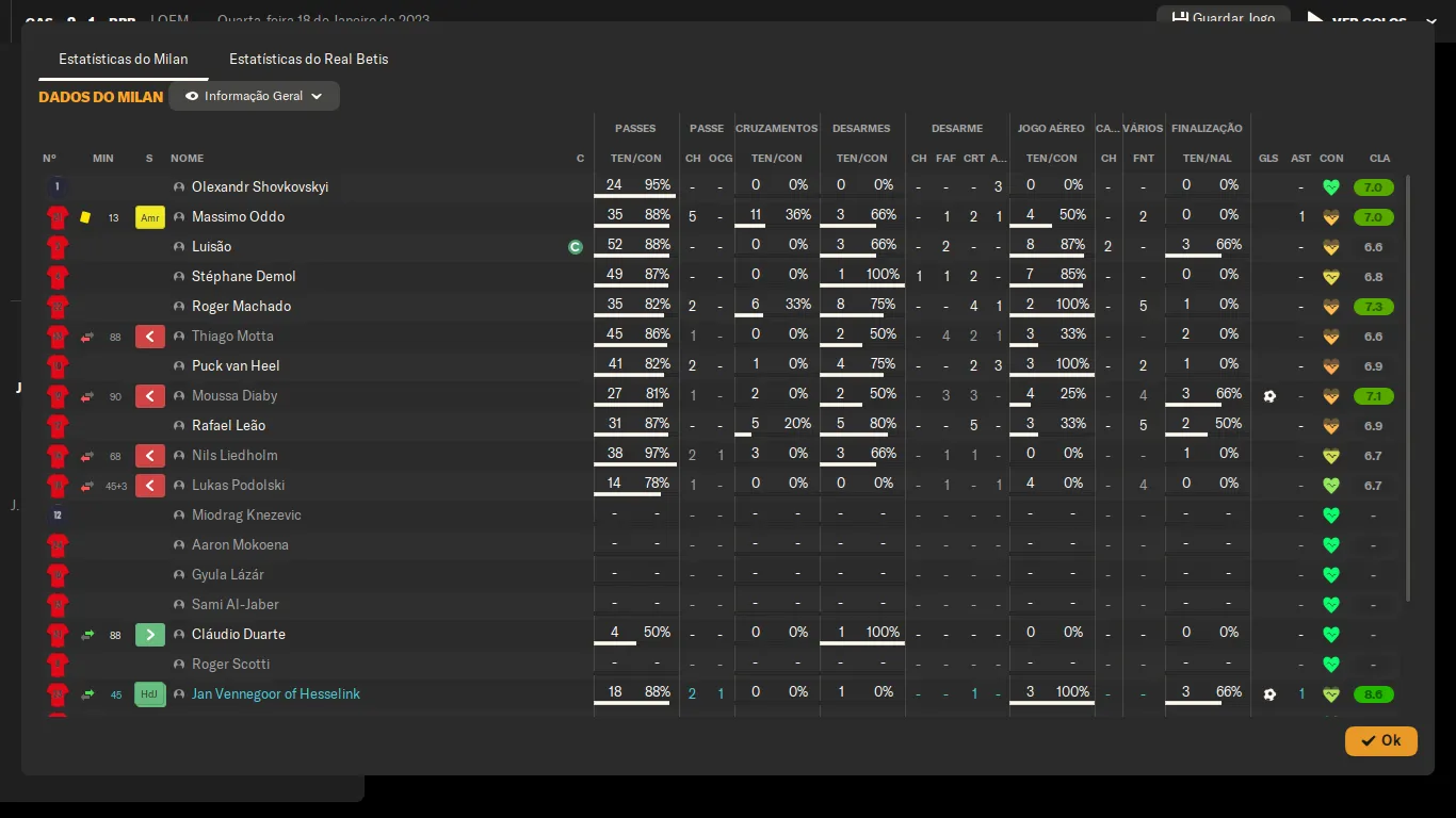 | Name | Jogos | Mins | Gols | Ass | Sofr | C.A. | C.V. | MeC | Class |