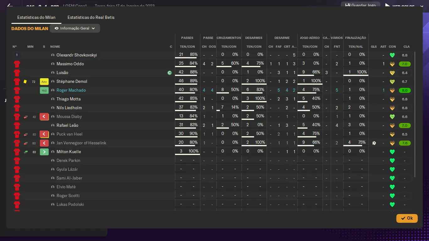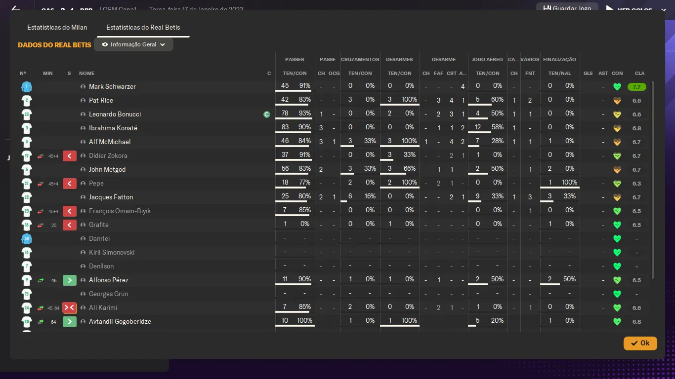 | Name | Jogos | Mins | Gols | Ass | Sofr | C.A. | C.V. | MeC | Class |
