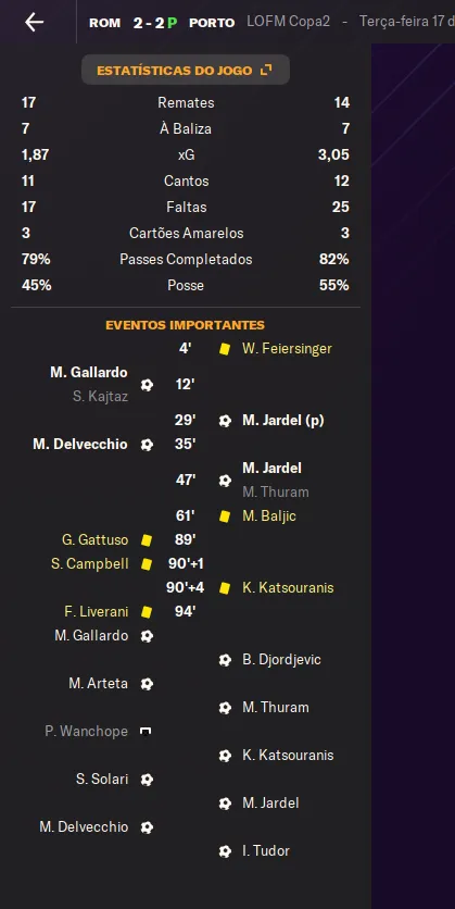 | Name | Jogos | Mins | Gols | Ass | Sofr | C.A. | C.V. | MeC | Class |