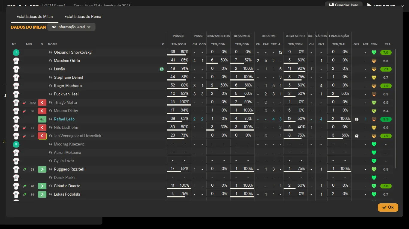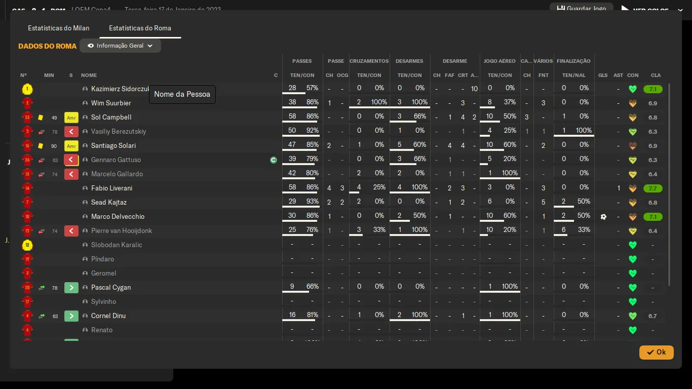 | Name | Jogos | Mins | Gols | Ass | Sofr | C.A. | C.V. | MeC | Class |