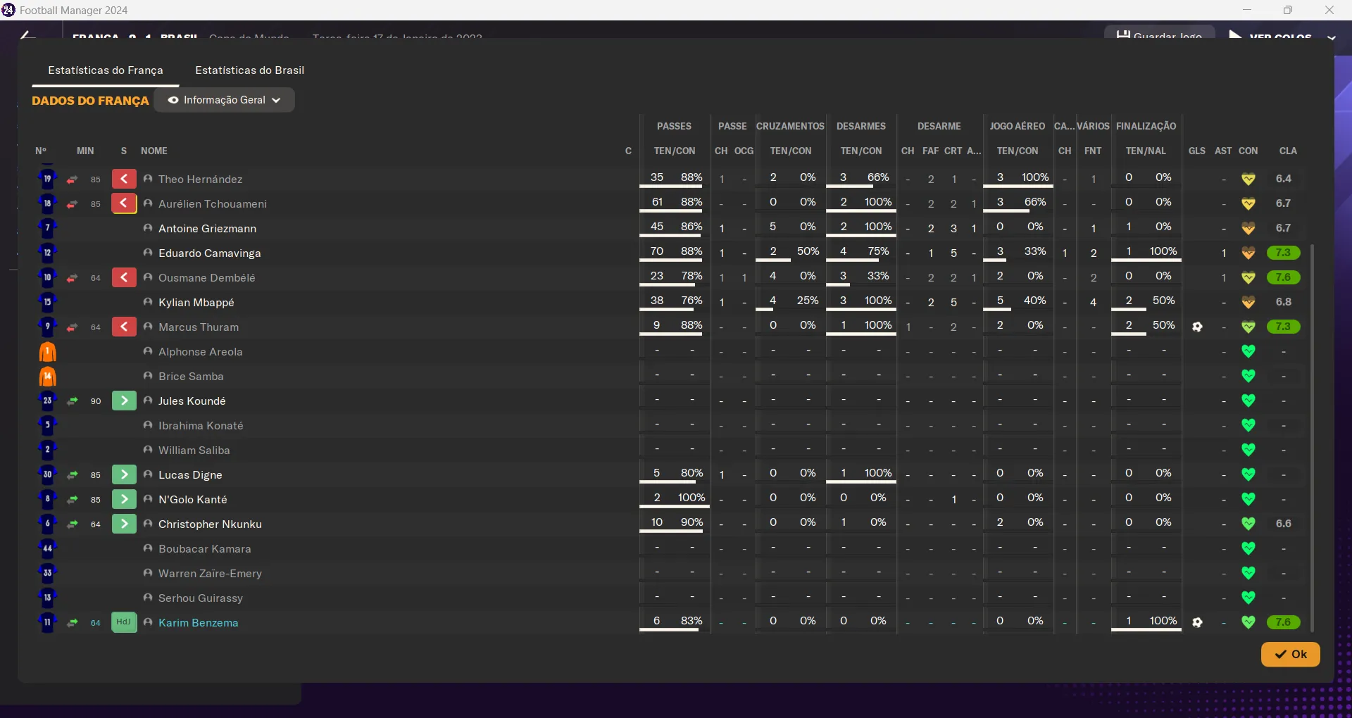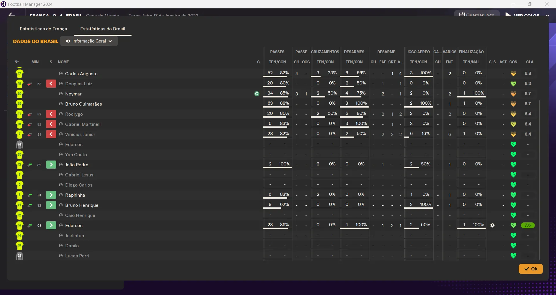 | Name | Jogos | Mins | Gols | Ass | Sofr | C.A. | C.V. | MeC | Class |