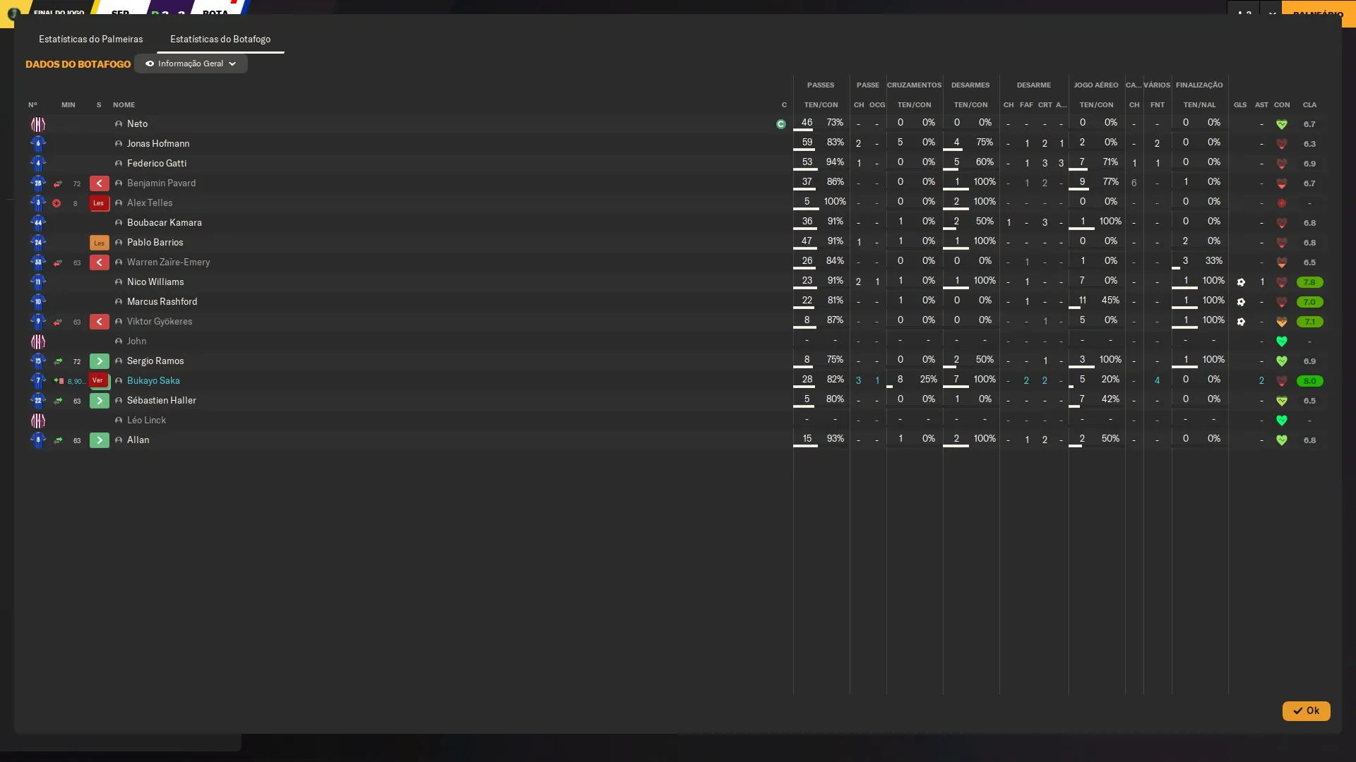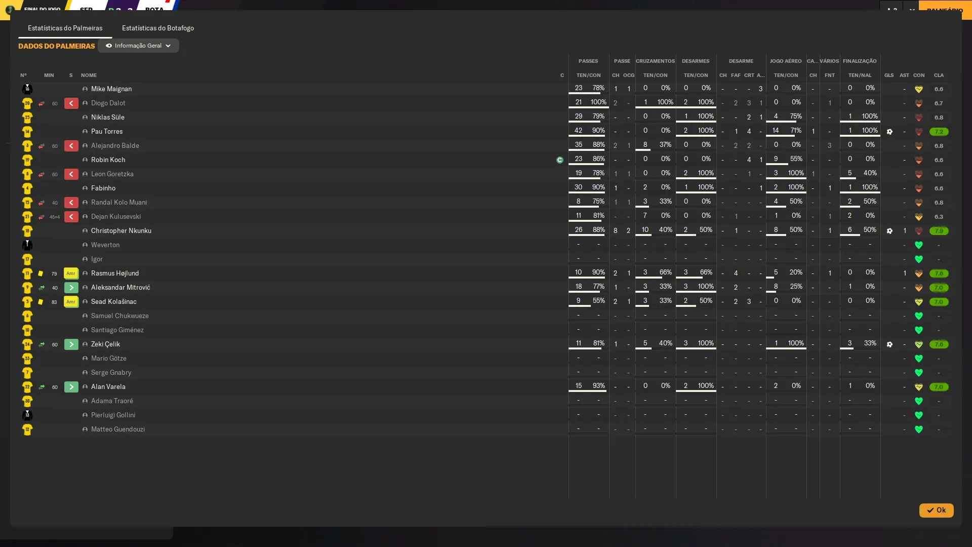 | Name | Jogos | Mins | Gols | Ass | Sofr | C.A. | C.V. | MeC | Class |
