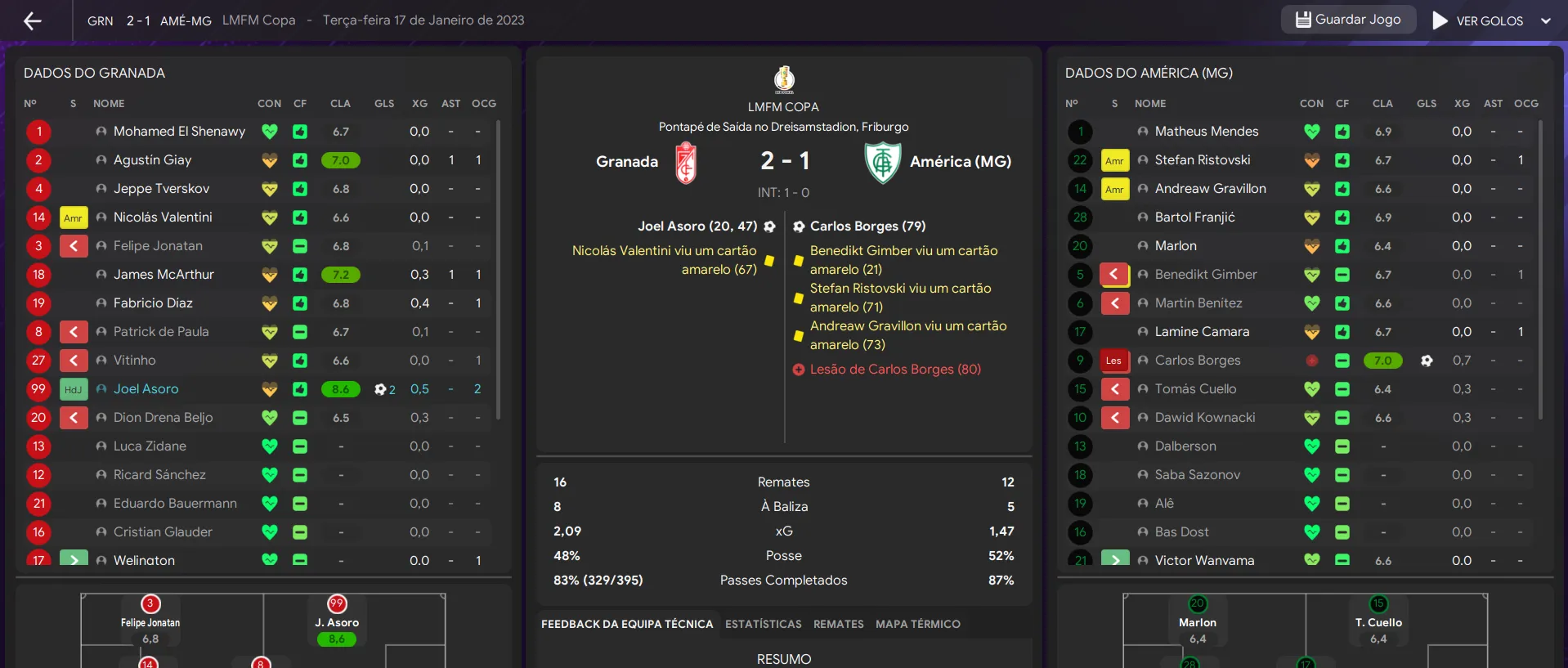 Name | Jogos | Mins | Gols | Ass | Sofr | C.A. | C.V. | MeC | Class |