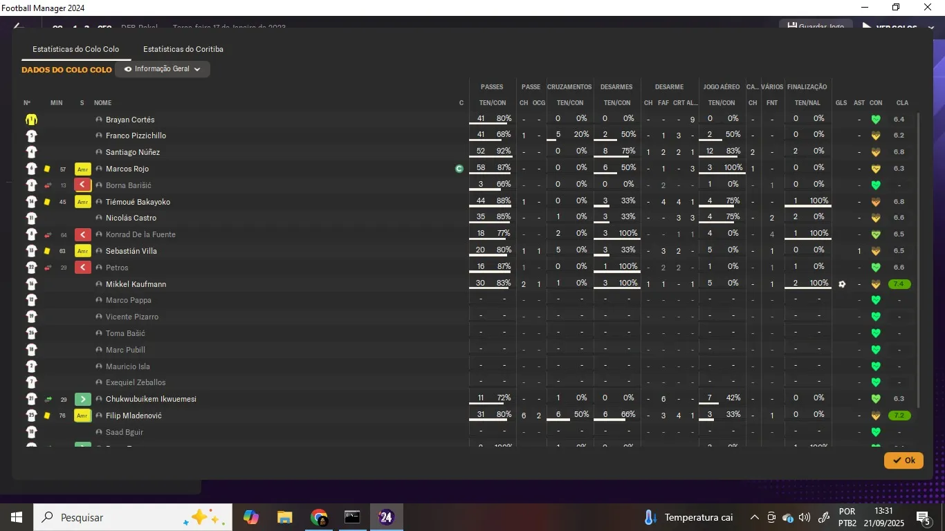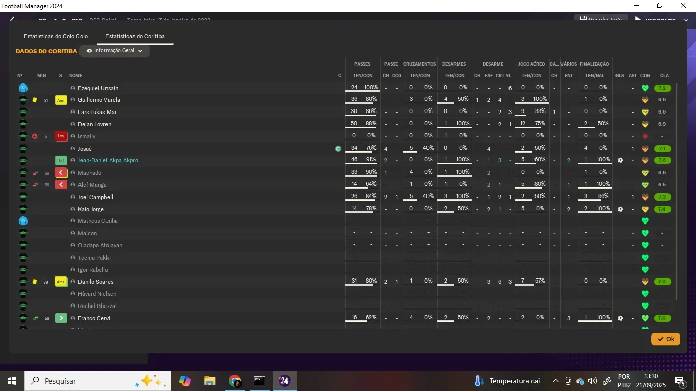 Name | Jogos | Mins | Gols | Ass | Sofr | C.A. | C.V. | MeC | Class |