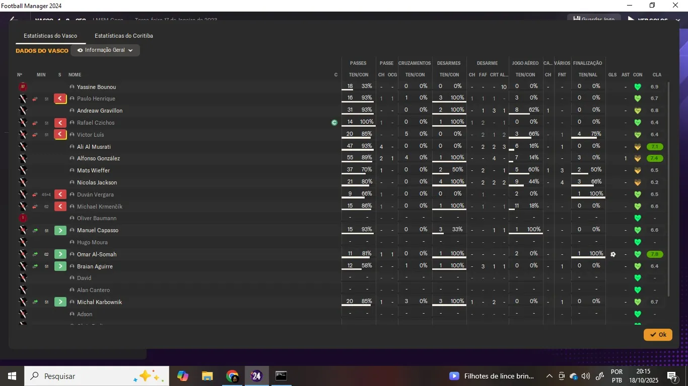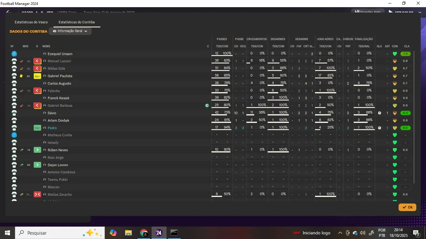 | Name | Jogos | Mins | Gols | Ass | Sofr | C.A. | C.V. | MeC | Class |