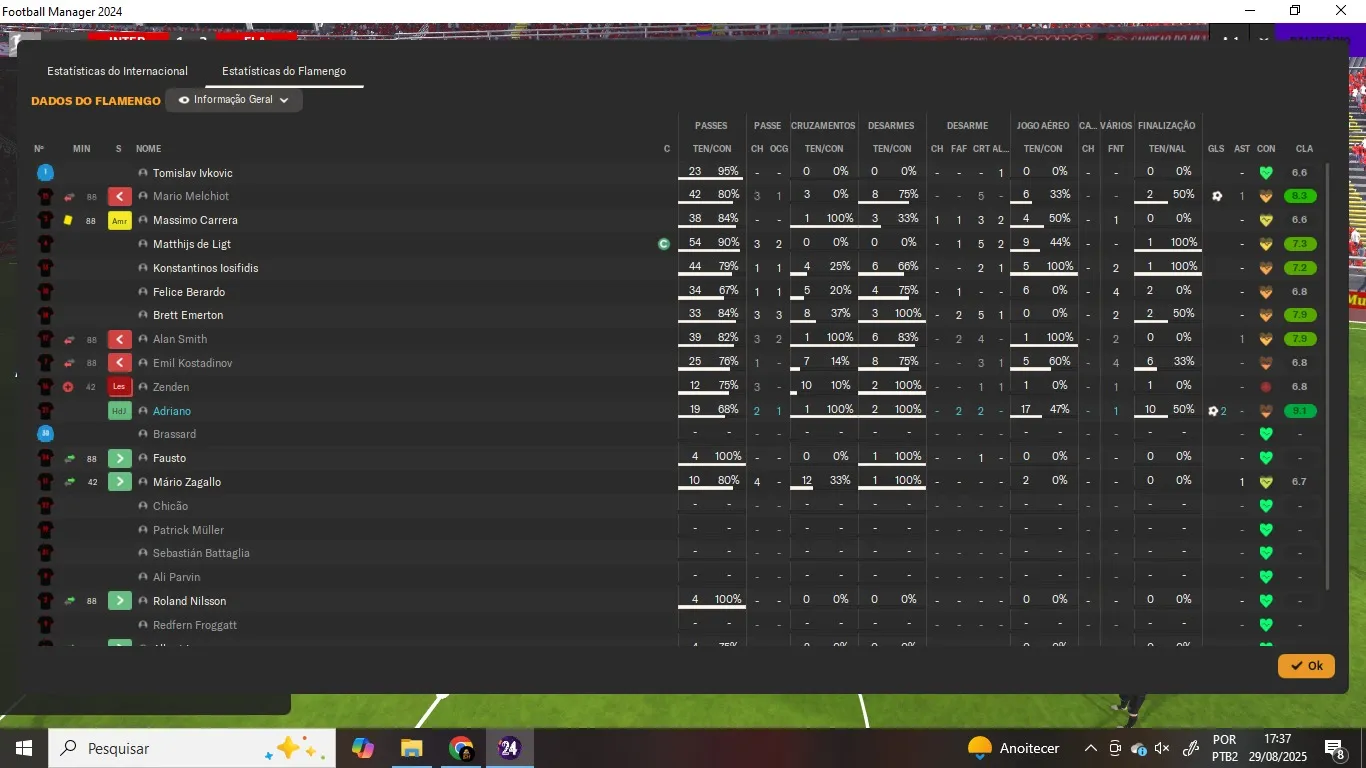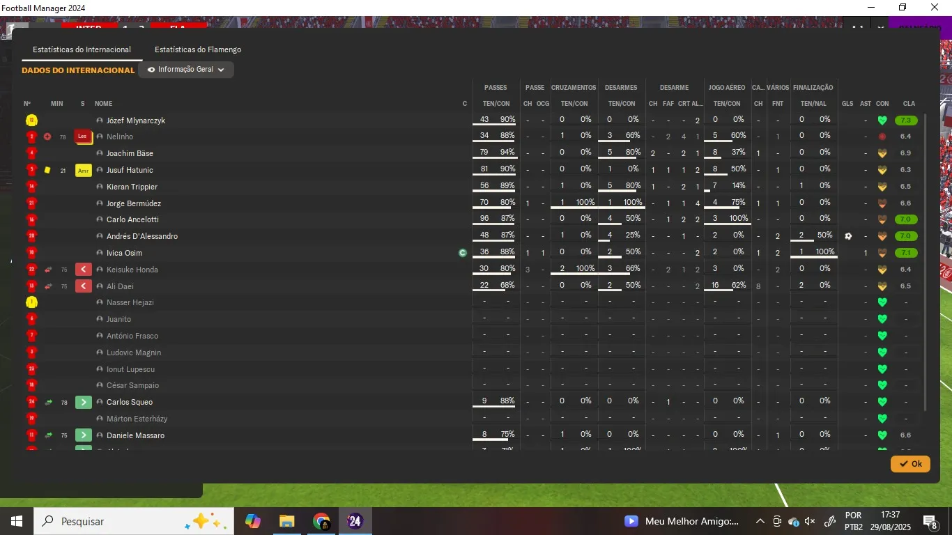Name | Jogos | Mins | Gols | Ass | Sofr | C.A. | C.V. | MeC | Class |