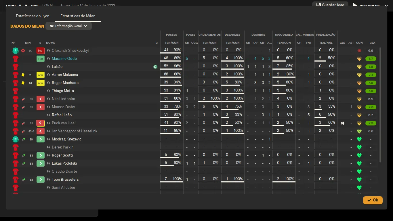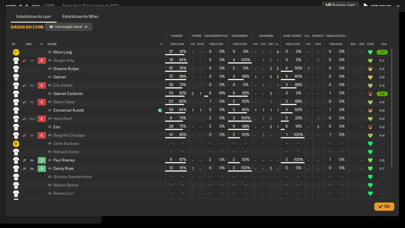 Name | Jogos | Mins | Gols | Ass | Sofr | C.A. | C.V. | MeC | Class |