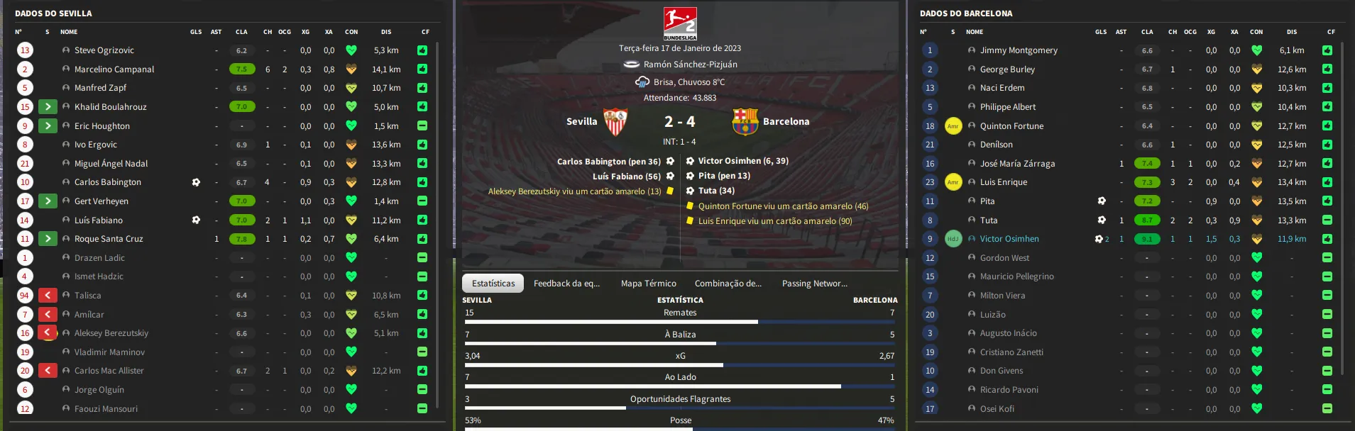 Name | Jogos | Mins | Gols | Ass | Sofr | C.A. | C.V. | MeC | Class |