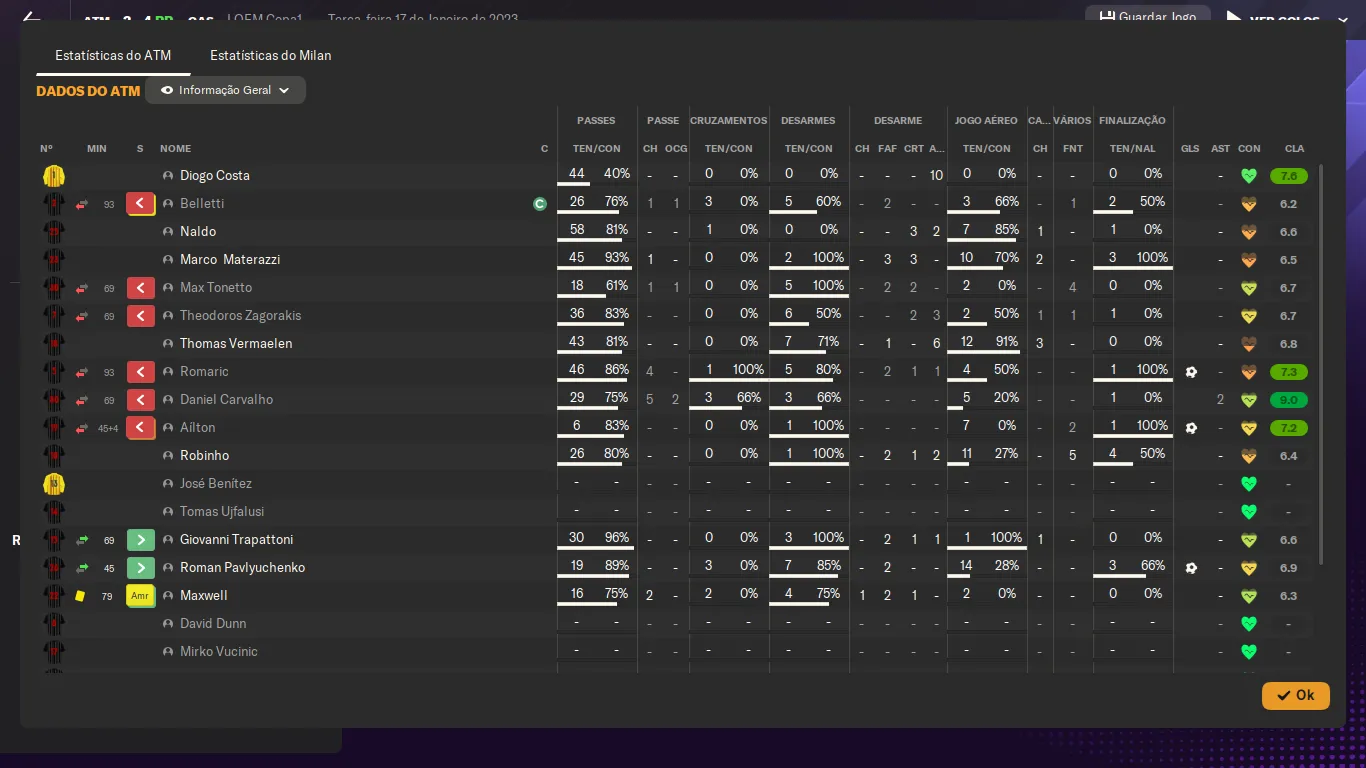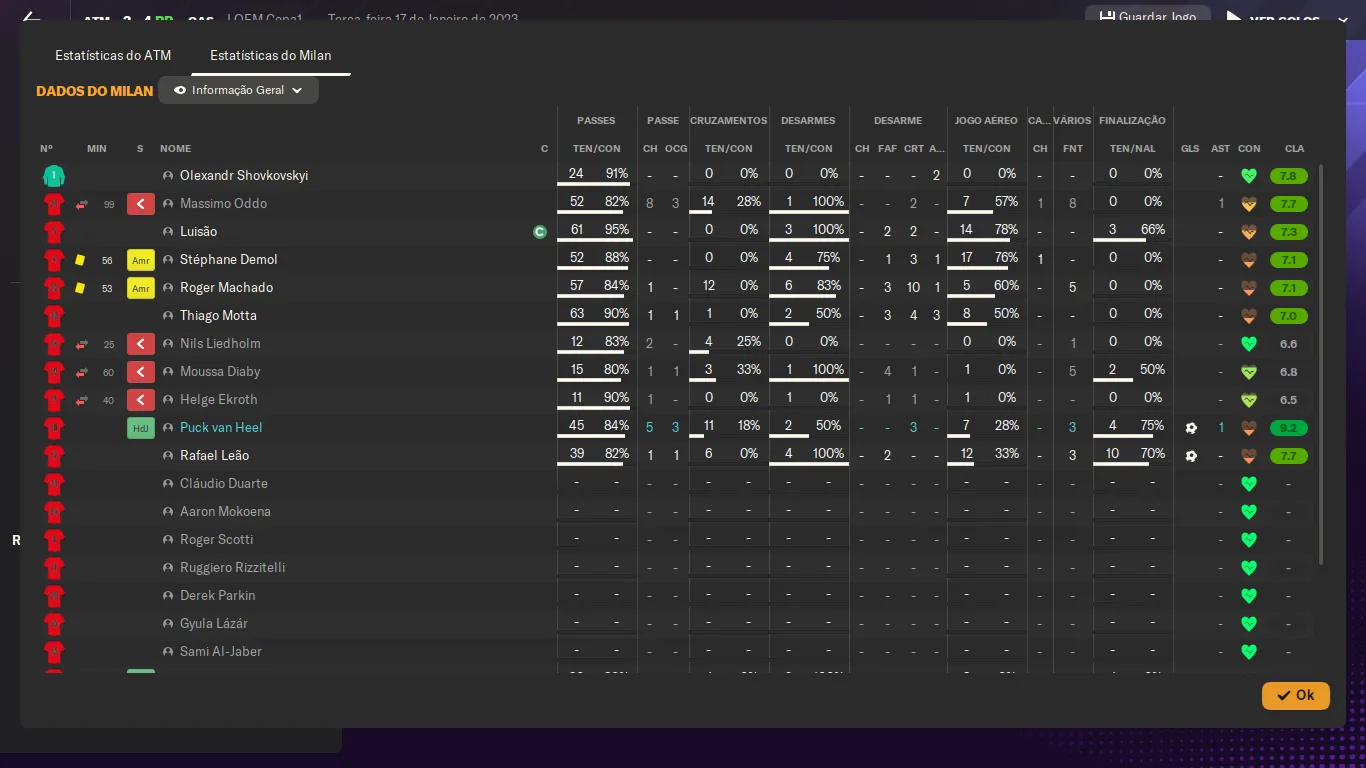 Name | Jogos | Mins | Gols | Ass | Sofr | C.A. | C.V. | MeC | Class |