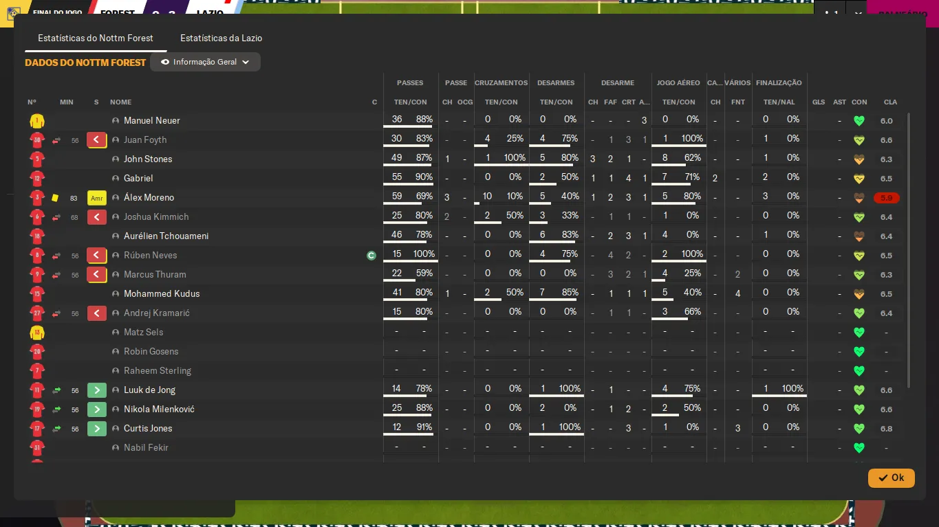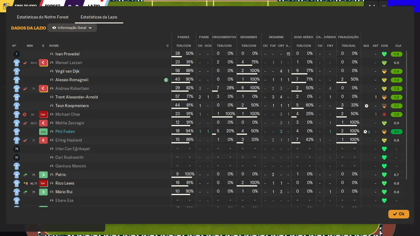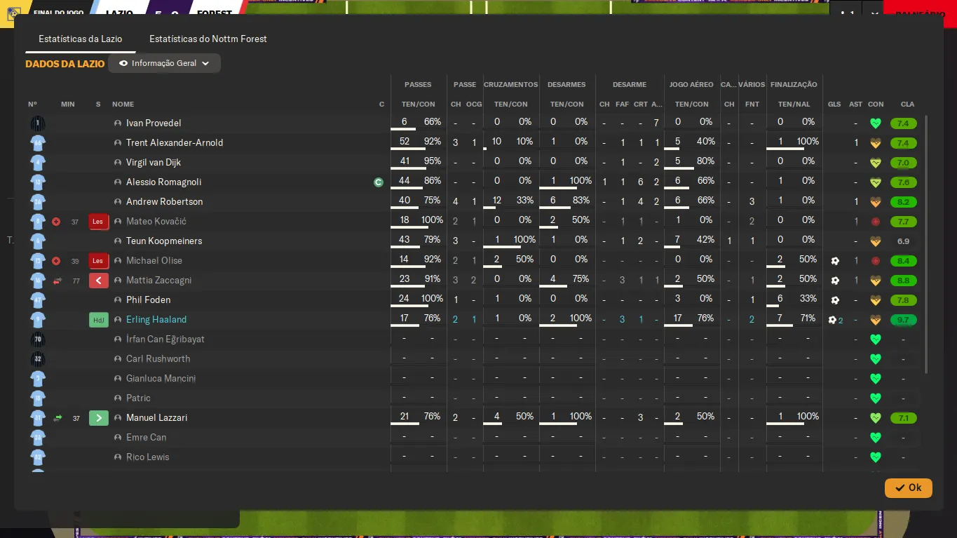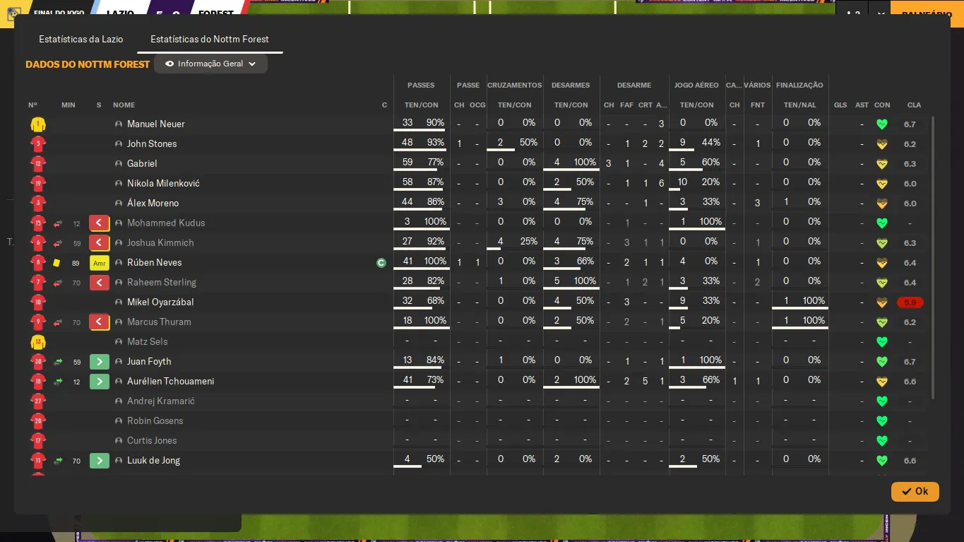 | Name | Jogos | Mins | Gols | Ass | Sofr | C.A. | C.V. | MeC | Class |